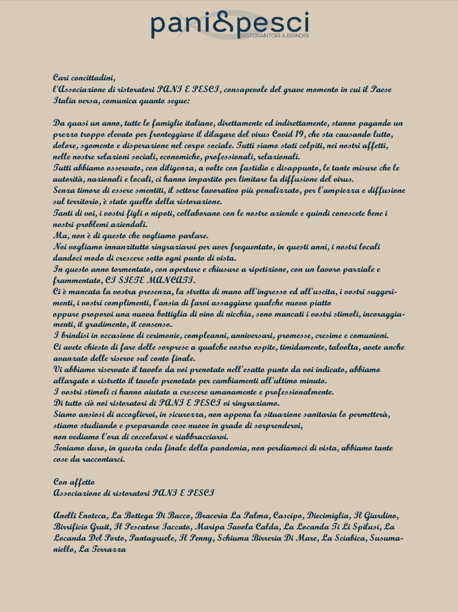 l’Associazione di ristoratori Pani e Pesci, consapevole del grave momento in cui il Paese Italia versa, comunica quanto segue: