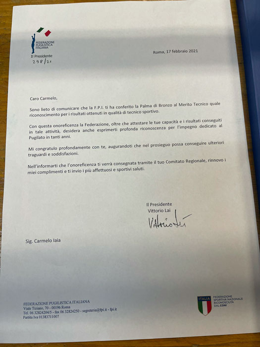 Il massimo esponente della Federazione Pugilistica Italiana ha scritto al maestro Iaia: “Caro Carmine, sono lieto di comunicare che la F.P.I. ti ha conferito la Palma di Bronzo al Merito Tecnico. Con questa onorificenza la federazione, oltre che a testare le tue capacità e i risultati conseguiti in tale attività, desidera anche esprimerti profonda riconoscenza per l’impiego dedicato al Pugilato in tanti anni. Mi congratulo profondamente con te, augurandoti che nel prosieguo possa conseguire ulteriori traguardi e soddisfazioni. Il presidente Vittorio Lai”