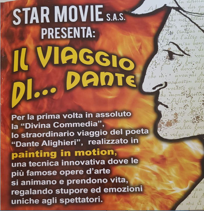 Nato in esclusiva nel Capoluogo Adriatico ad opera della azienda Star Movie del brindisino Sergio Lipari che firma anche la regia di questo filmato originale della durata di circa 25 minuti, il progetto, è dedicato alla suo opera più rappresentativa del Sommo Poeta, la Divina Commedia. realizzato con la tecnica innovativa del painting in motion, dove le più famose opere d’arte si animano e prendono vita, regalando stupore ed emozioni uniche agli spettatori. Scene spettacolari guidano gli alunni nell’immensa storia di Dante come in un racconto fantasy attraverso forme, colori e le figure di misteriosi personaggi. Ad oggi, “Il viaggio di Dante” rappresenta una novità assoluta in materia di apprendimento basata su una delle più importanti ed apprezzate opere letterarie della storia italiana.