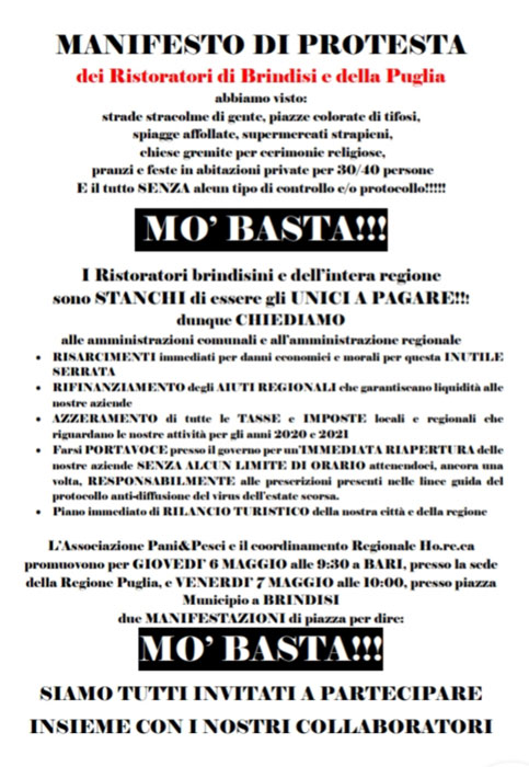 MANIFESTO DI PROTESTA DEI RISTORATORI DI BRINDISI E DELLA PUGLIA: