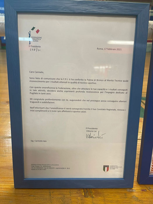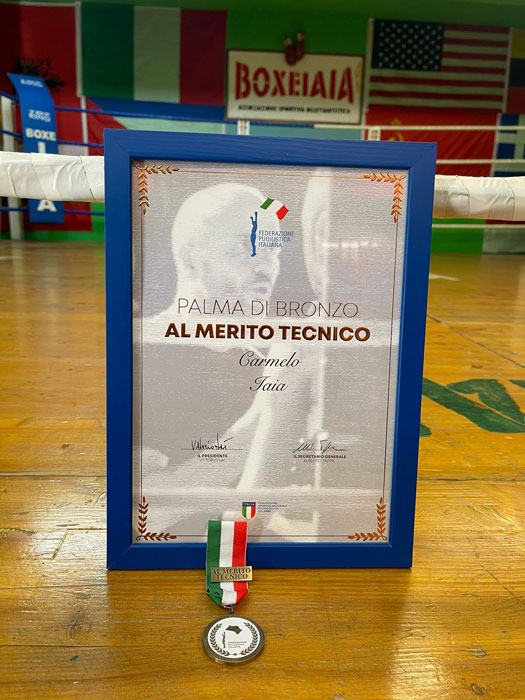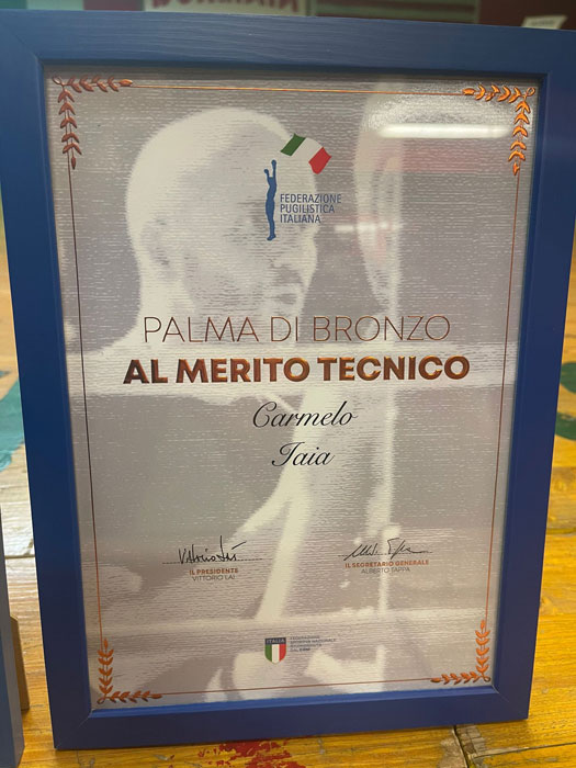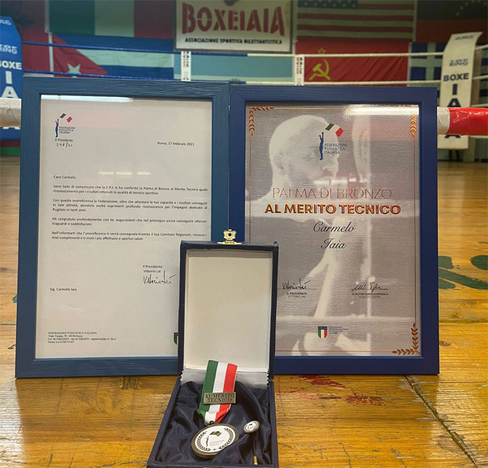 Il massimo esponente della Federazione Pugilistica Italiana ha scritto al maestro Iaia: “Caro Carmine, sono lieto di comunicare che la F.P.I. ti ha conferito la Palma di Bronzo al Merito Tecnico. Con questa onorificenza la federazione, oltre che a testare le tue capacità e i risultati conseguiti in tale attività, desidera anche esprimerti profonda riconoscenza per l’impiego dedicato al Pugilato in tanti anni. Mi congratulo profondamente con te, augurandoti che nel prosieguo possa conseguire ulteriori traguardi e soddisfazioni. Il presidente Vittorio Lai”