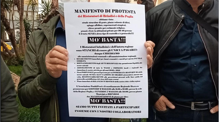 Le istanze, già evidenziate nei giorni precedenti la manifestazione, erano state illustrate in un manifesto diffuso proprio dall’associazione e consistevano in un rifinanziamento degli aiuti regionali per garantire liquidità alle aziende, nell’azzeramento di tutte le tasse e le imposte locali e regionali relative alle attività per gli anni 2020/21, nella possibilità che i comuni e la regione si facessero portavoce presso il Governo di una immediata riapertura delle aziende di ristorazione senza alcun limite di orario e ancora una volta responsabilmente con il rispetto delle prescrizioni presenti nelle linee guida del Protocollo antidiffusione del virus dell’estate 2020 ed infine nella redazione di un piano immediato di rilancio turistico della città di Brindisi dove le opinioni e le idee della Associazione potessero essere considerate come integrazione in un percorso condiviso.