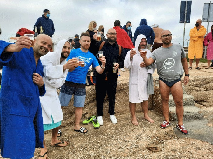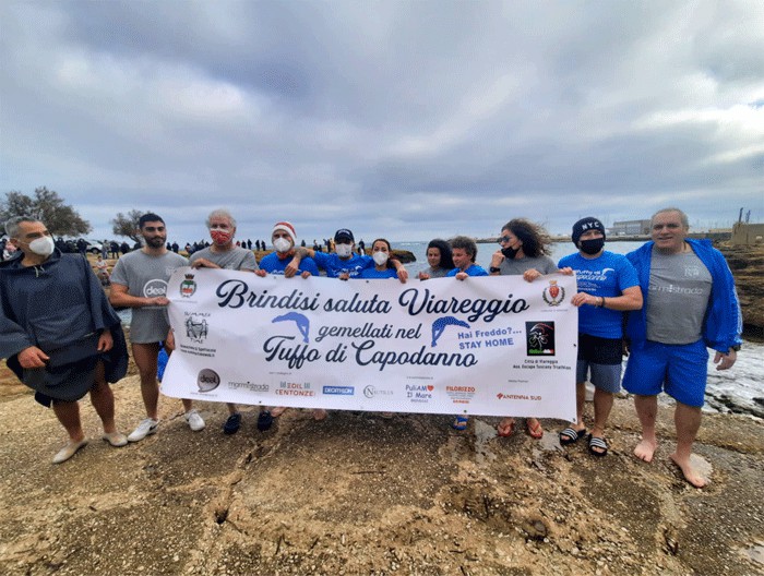 celebrazione dell’ormai consolidato “Gemellaggio Morale” con il Tuffo di Capodanno – Città di Viareggio, organizzato in Toscana dall’Asd Escape Tuscany Triathlon del Presidente Aldo Angeli, che ha ideato l’ormai ‘famosa’ cuffia con il motto “Hai Freddo?…STAY HOME”.